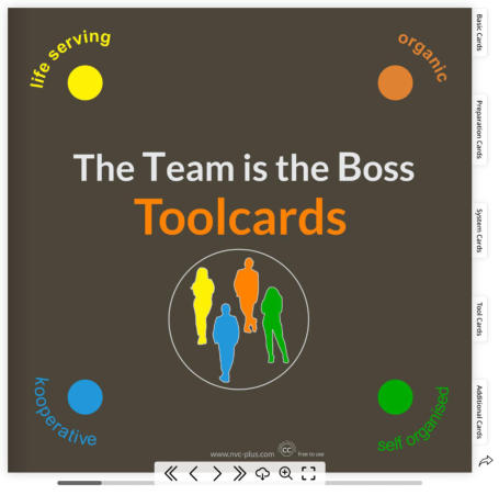 Achangeprocessshouldbeaspracticalandplayfulaspossible.Inthecourseofourresearch,wecame upwiththeNVC-pluscards.Wedesignedthemstepbystepandaremakingthemfreelyavailabletoyou aspartof“TheTeamistheBoss”(cc-commons),meaningthatanyonecanusethemfreelyasworking material for personal and professional purposes. These cards are classified as:1. base cards2. preparation cards 3. system cards4. tool cards5. additional cardsThe base cards describe the Four-Step-Circle. With the preparation cards, everyone can prepare for a team self-organized with NVC-plus. Thesystemcardsareusedtounderstandthedifferencebetweenaconventionalfunctionalsystemanda NVC-plussystem.Boththepreparationcardsandthesystemcardsareonlyneededonce,namelyto understand the changed view of the individual and the system (team, company, initiative, family, etc.). Thetoolcards,ontheotherhand,helpagainandagaintopracticallysolvethemostimportant requirementsinthefourNVC-plusfields.Youdon'tneedallthetoolcards.Taketheonesthatsuityou.If you are unsure, then get the starter pack and I will put some together for your case.The additional cards highlight some useful side aspects that can be interesting from time to time.Itmaynotmakemuchsensetotrytounderstandthemallrightaway.Youcanfindthecardswithor without descriptions in the GFK-plus app or in the download tool depot.