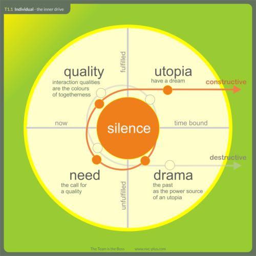 Self-control means that people control from within themselves. If we ask someone random about politics, environmental protection or technology, such as self-driving cars, we will hear one opinion. If we ask a lot of people, we won't hear a lot of opinions, but a few, some of which are very similar. We tend to put together a kind of patchwork opinion from information we have picked up, which is very similar to the opinions of many others who do the same. We therefore seem to be more opinion leaders than opinion formers. Unfortunately, opinions are unsuitable as a central element for constructive self-direction, because they have too little to do with ourselves and the future we are striving for. Personal dramas are also ruled out as an organizational element. Although they are individual and also contain a certain amount of our vitality, they are unfortunately directed towards the past and are more concerned with avoiding destruction than with constructing an optimal future. A person's dramas are also not a good networking point for others who have their own dramas. They are simply very individual experiences. In classic non- violent communication, we work with needs. These are very similar in all people around the world and are well understood. They encourage us to move through life. However, they do not carry any further design logic, which is why in classic NVC you always have to add a current and feasible request. Individual problems can be clarified very well in this way, but it is difficult to imagine organizing a system with this communicative effort. So we need a common forward-looking and positive creative direction in the team. So we came up with what we call utopia as a starting point. You can also call it a dream, individual visions, etc., but the term utopia gave us the most pleasure.